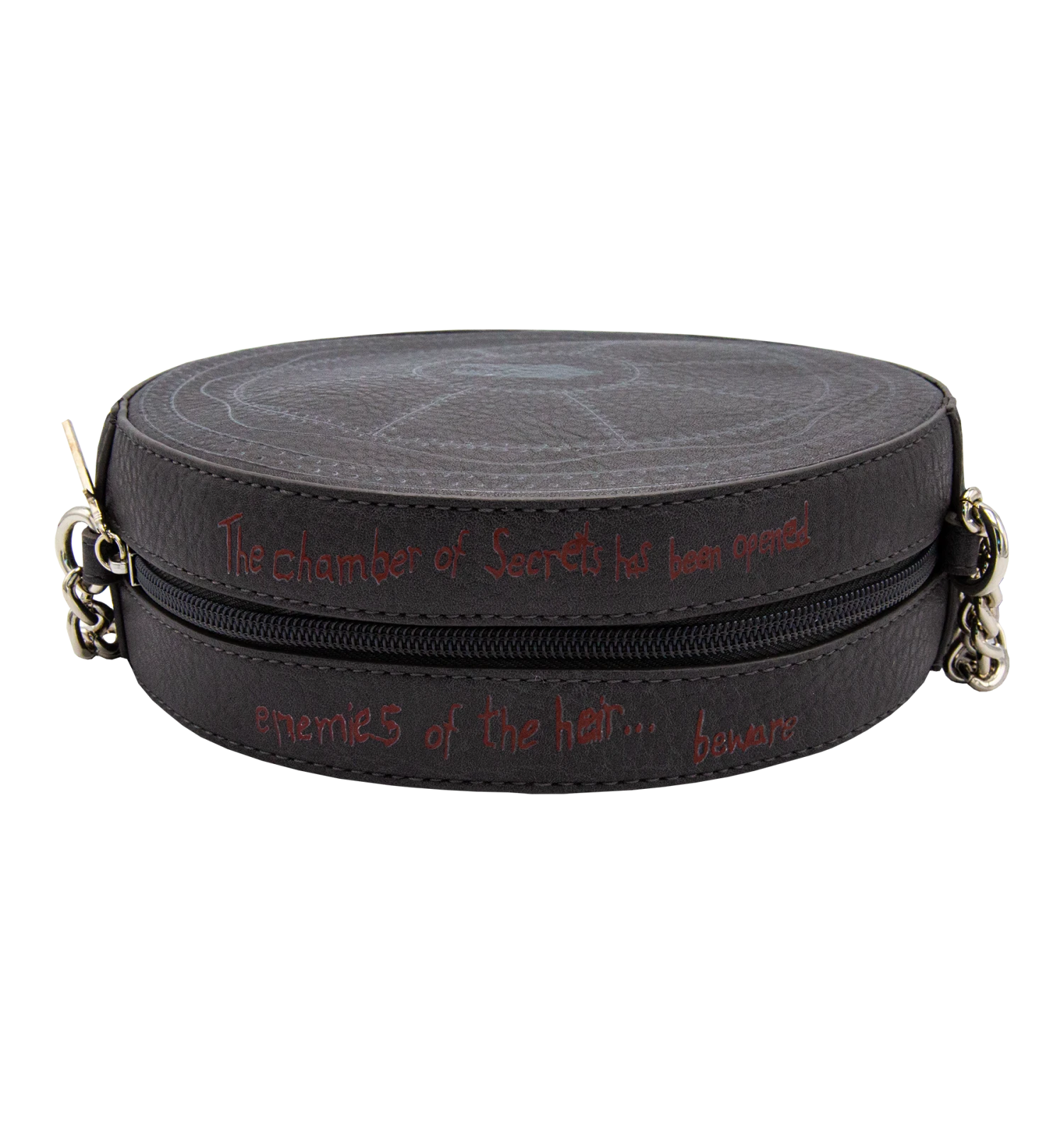 Embrace the unknown and let the Chamber of Secrets Crossbody Bag beckon you into a world of dark magic and intrigue! Crafted from polyester lining and a durable grey PU exterior, this bewitching circular bag boasts a sinister appearance reminiscent of the infamous front door to the Chamber of Secrets from the Harry Potter films.