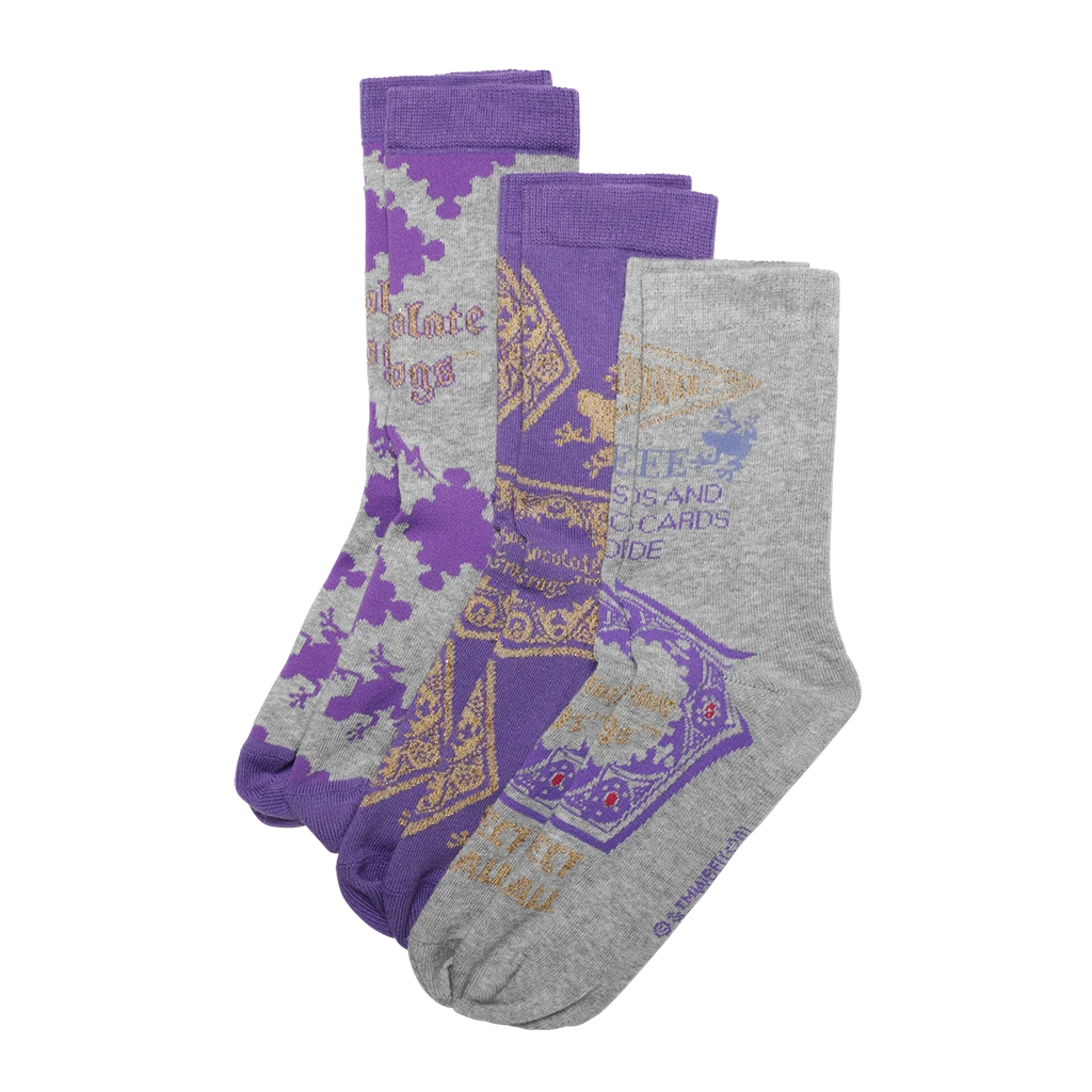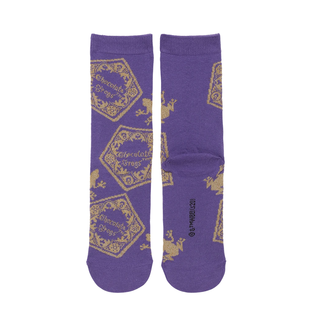 Chocolate Frogsâ„¢ are a staple of the wizarding world. This three-pack of Chocolate Frog Socks features different designs inspired by the signature design of chocolaty treat seen in the Harry Potterâ„¢ film series. S/M = US size 5-9. M/L = US size 10-12.