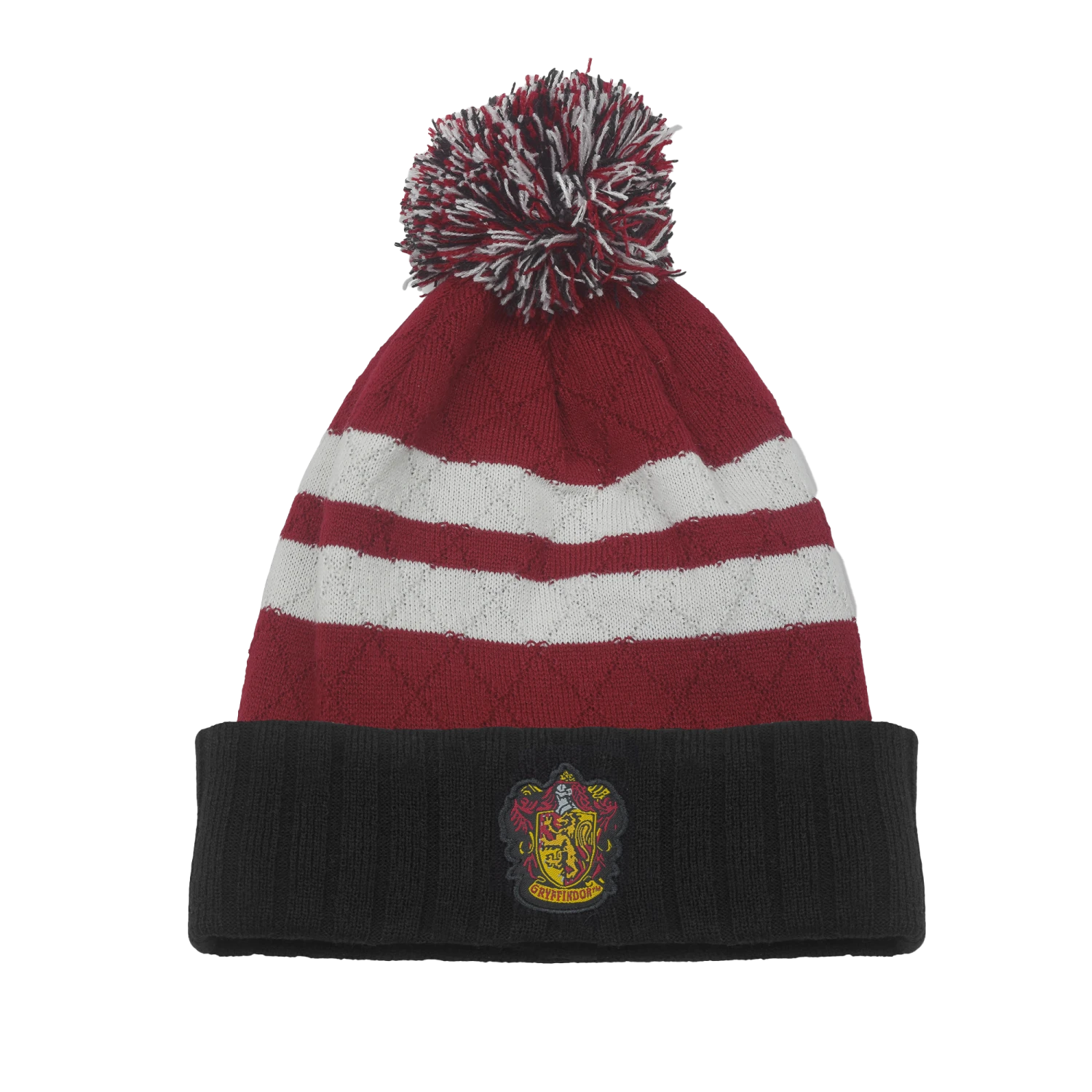 The iconic Gryffindor crest is embroidered into the center of the hat and overlaid on a black background. The bobble on the top of the hat is coloured with red and white tassels.