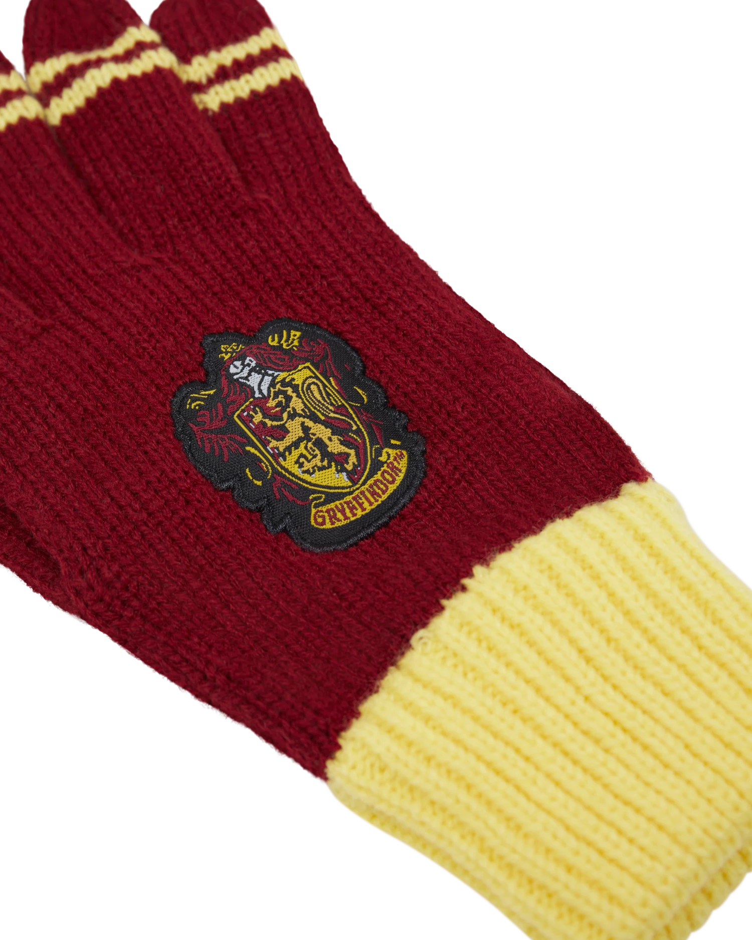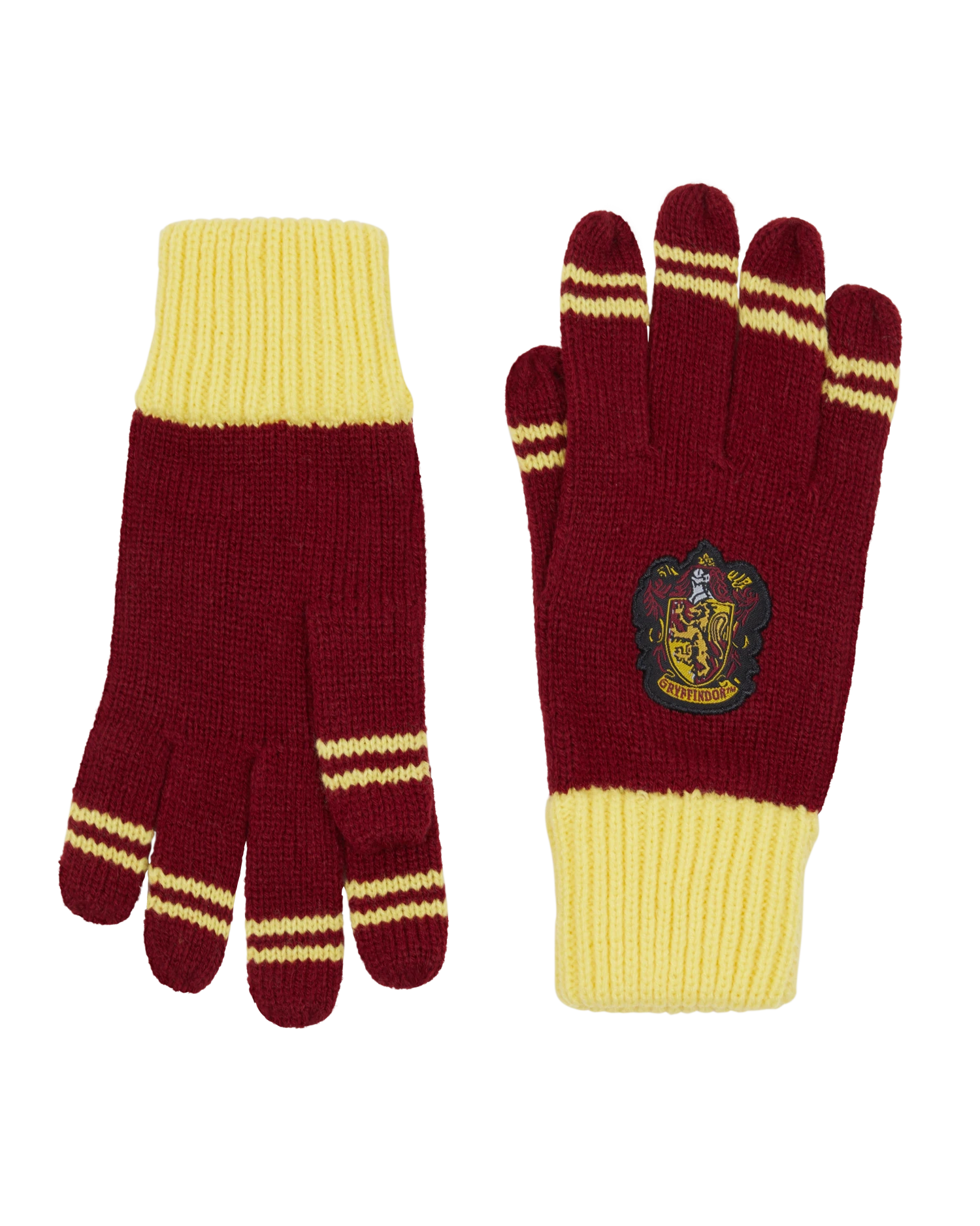 Keep warm and complete your Hogwarts school look with this striped knitted pair of Gryffindor gloves. Both gloves come in the traditional Gryffindor colours of red and yellow and feature an embroidered patch of the Gryffindor crest. The gloves are complete with two yellow stripes on the end of each finger, and yellow cuffed wrists for comfortable wear.