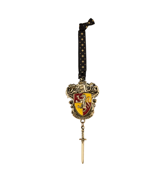 The ornament is perfect for hanging up around your home with its bespoke black ribbon featuring gold stars and a little bow. Made with an antique brass finish, the ornament is complete with a small silver sword representing the famous Sword of Gryffindor, once owned by the famed wizard Godric Gryffindor.