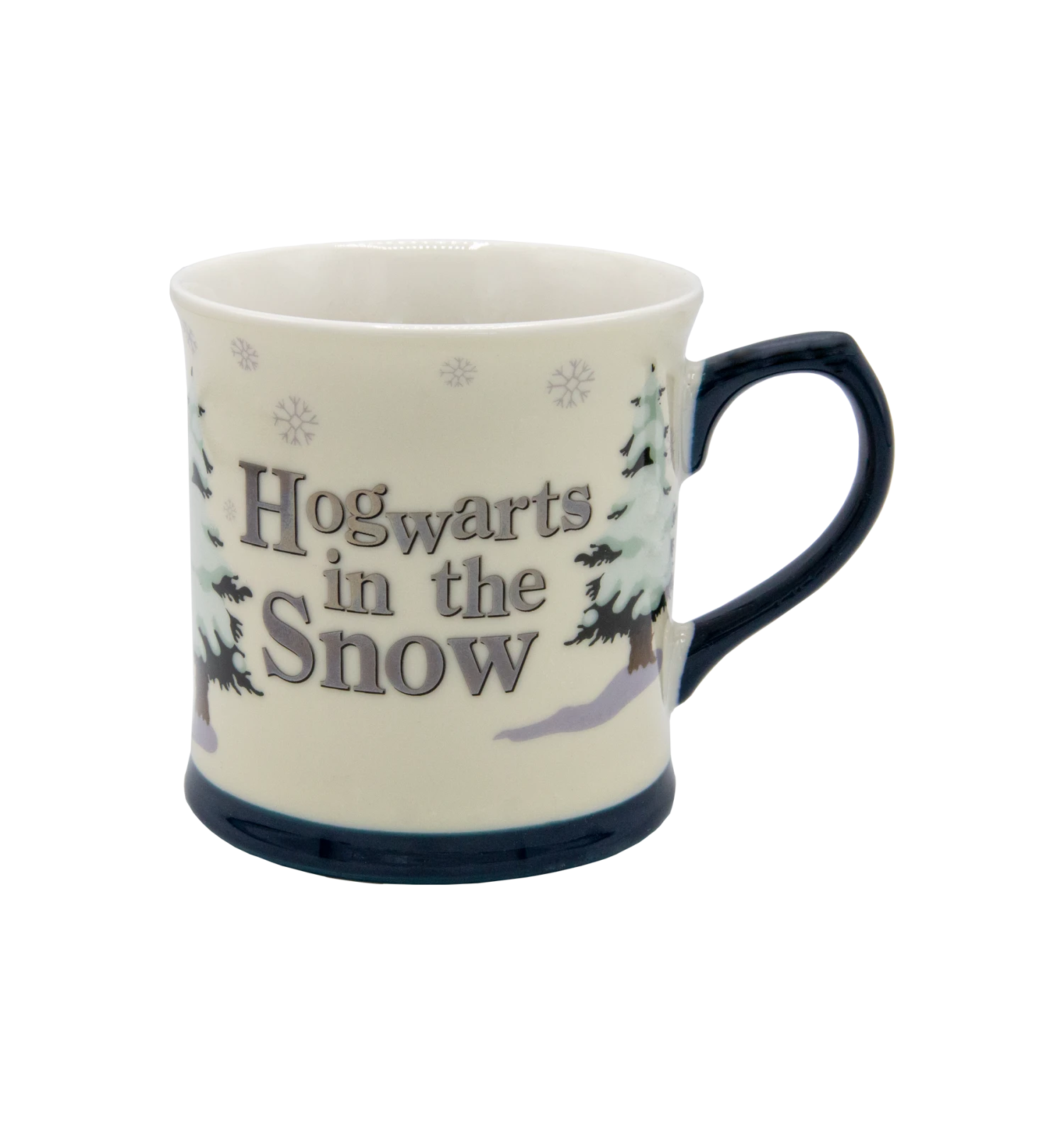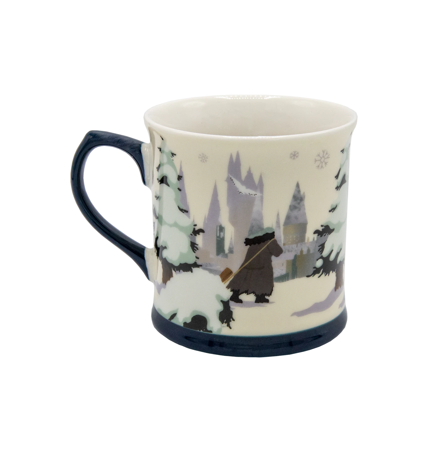 Made from white ceramic, this festive mug has a navy base and handle evocative of a frosty winter evening. It accompanies a delightful illustrated design of Hagrid pulling a snow capped fir tree towards Hogwarts Castle. The reflective silver metallic font reads “Hogwarts in the Snow” on the opposite side, surrounded by softly drifting snowflakes.