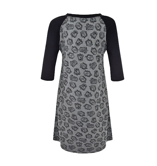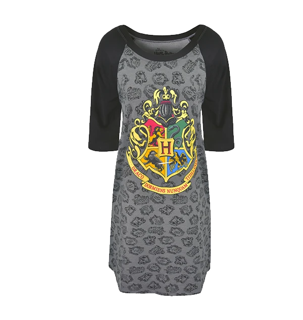 Celebrate your Hogwarts school pride with this oversized raglan Hogwarts sleepshirt. The cosy sleepshirt, which features three-quarter length sleeves and comes in black and grey, showcases a large print of the Hogwarts crest printed in the centre. The four house crests of Gryffindor, Slytherin, Ravenclaw, and Hufflepuff are patterned behind it.