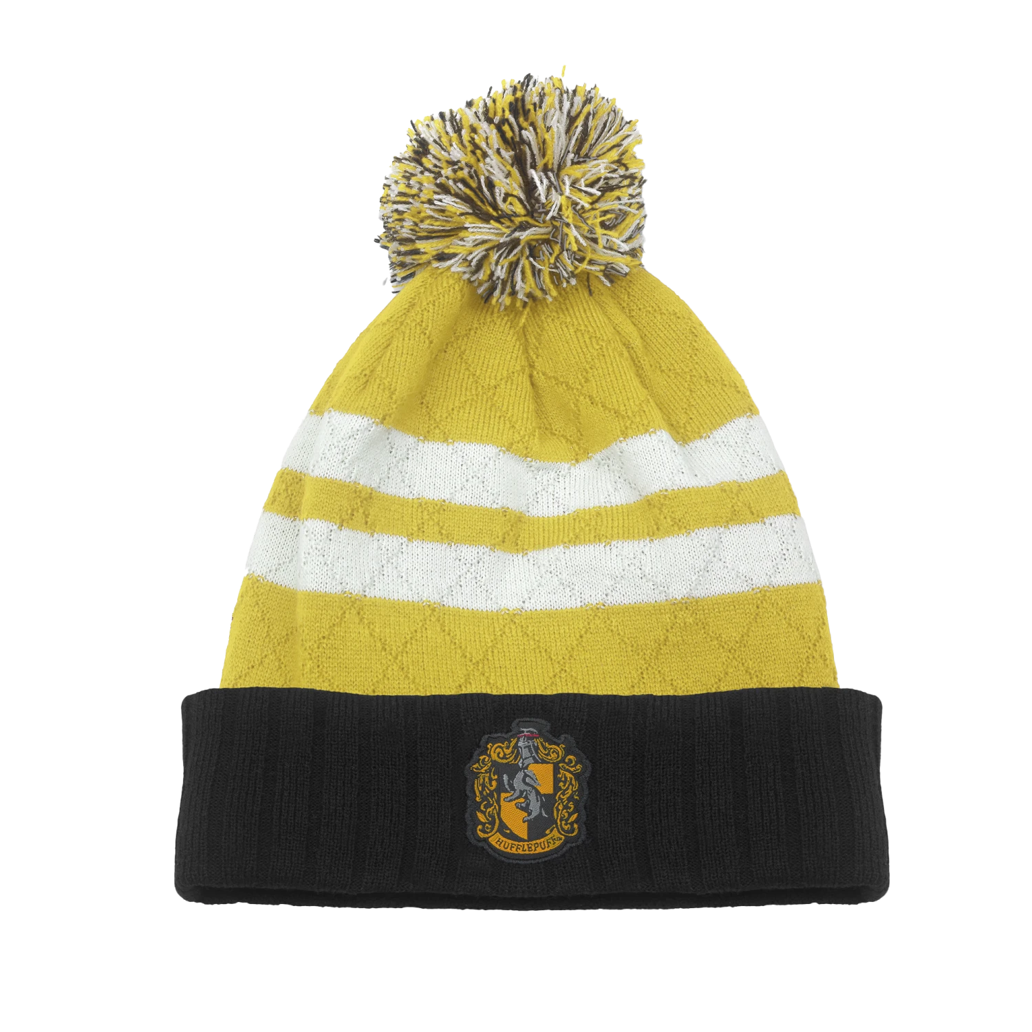 The iconic Hufflepuff crest is embroidered into the center of the hat and overlaid on a black background. The bobble on the top of the hat is coloured with yellow, black, and white tassels.
