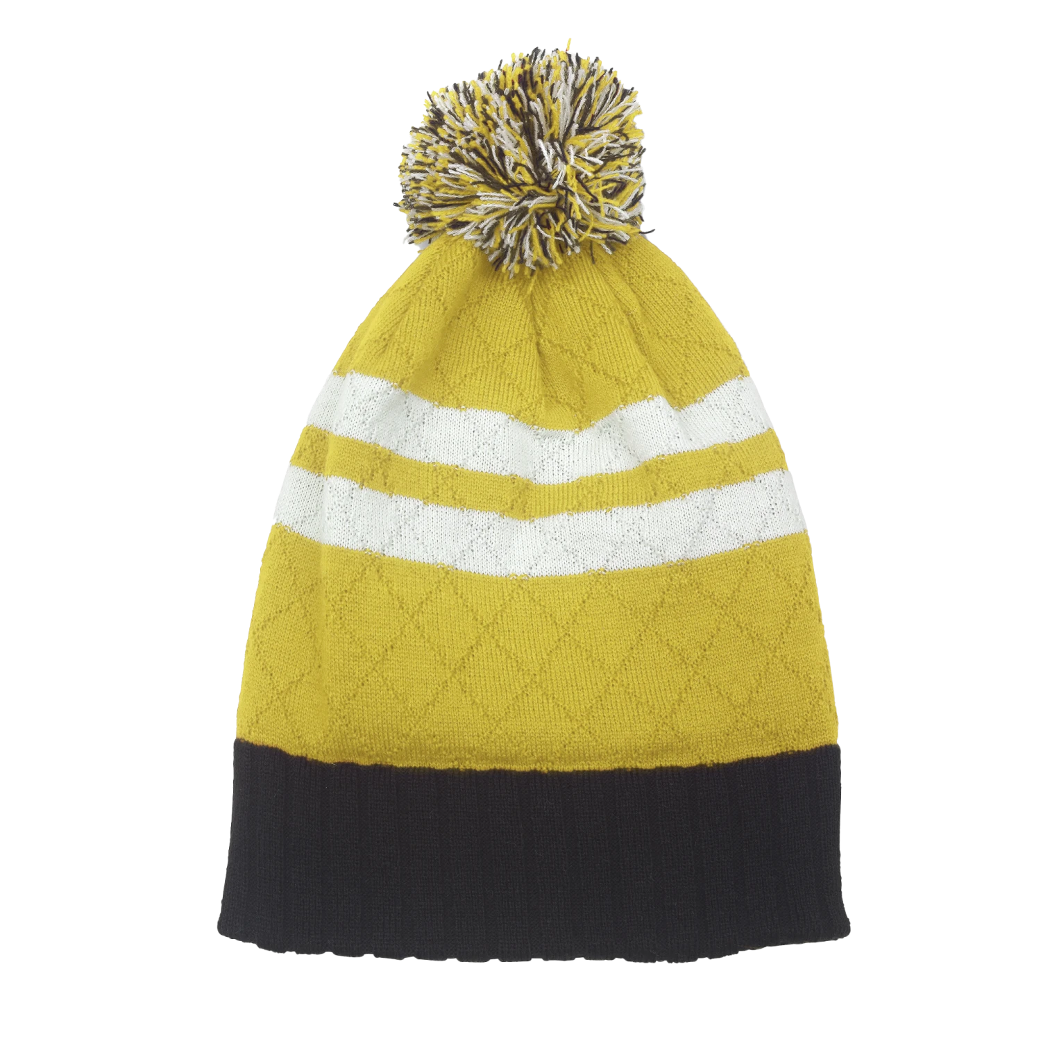 Show off your house pride and keep warm with this Hufflepuff bobble hat. The hat comes in a honey yellow, the traditional colour of Hufflepuff house and features two white stripes.
