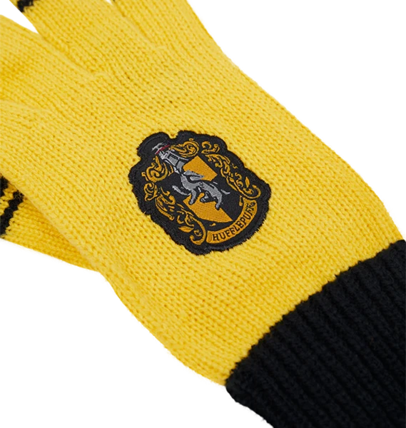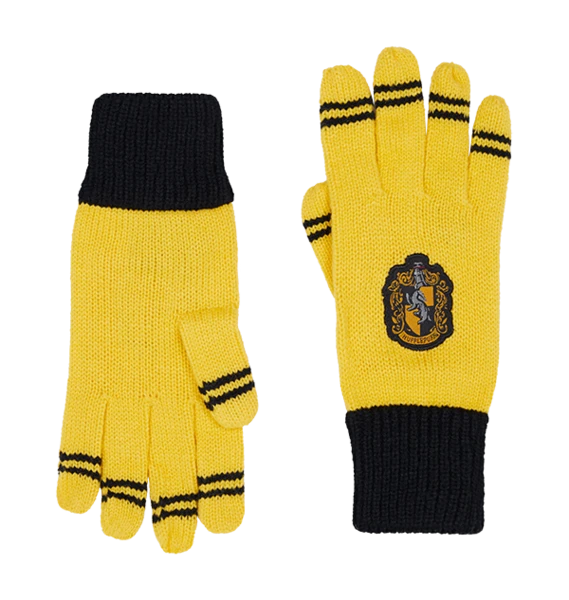 Keep warm and complete your Hogwarts school look with this striped knitted pair of Hufflepuff gloves. Both gloves are the trademark Hufflepuff colours of yellow and black, and feature an embroidered patch of the Hufflepuff crest.