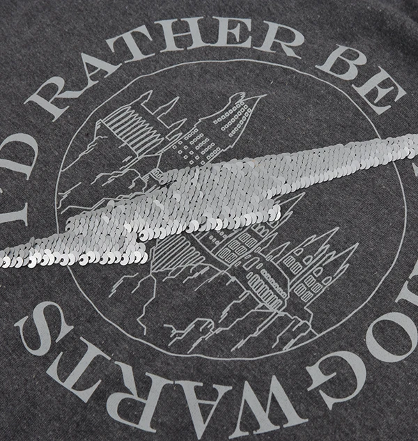 This stunning dark grey shirt has a centre image of Hogwarts Castle, surrounded by the slogan “I’d rather be at Hogwarts”. Across the image of the castle, you can find a sequin lightning bolt. This embellishment is reversible; if you brush the sequins in one direction, the lightning bolt becomes silver. If you brush in the other direction, they become black.