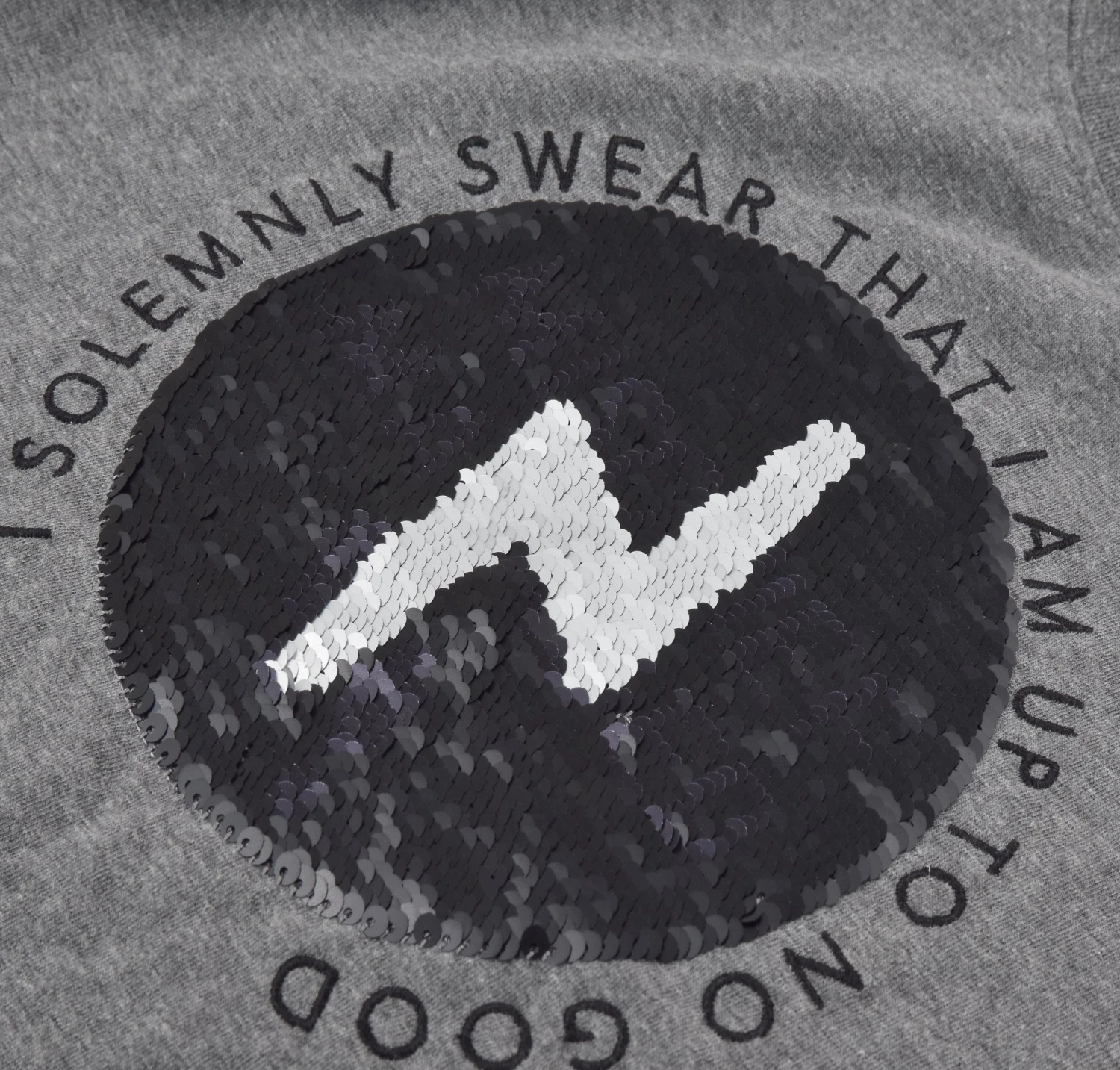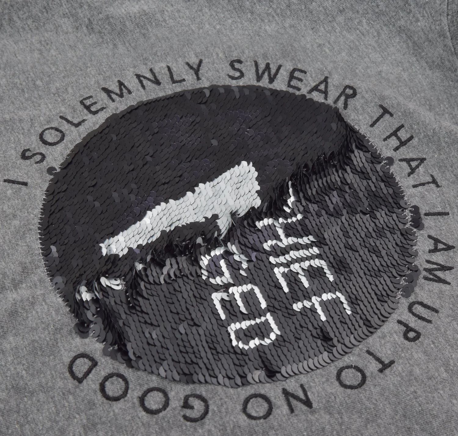 Unleash some magical mischief with this captivating Marauder’s Map kids t-shirt. This enchanting grey shirt showcases a mesmerizing black and silver sequin Mischief Managed logo on the front, ready to astonish. Brush the sequins upward to reveal a hidden lightning bolt image! Completing the spellbinding design, circular embroidered text reads ‘I solemnly swear that I am up to no good,’ capturing the spirit of the Marauder’s Map.