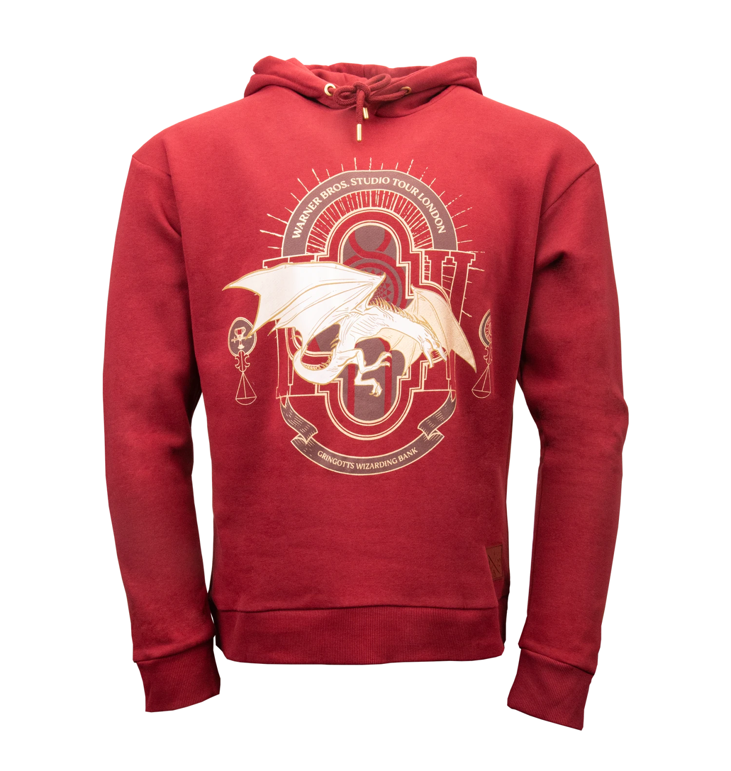 This exclusive crimson-red hoodie is unique to the London Iconic Gringotts collection and features a striking graphic illustration of the white Ukrainian Ironbelly dragon flying over top a geometric design, representing the dramatic break-out from Gringotts Bank vault.