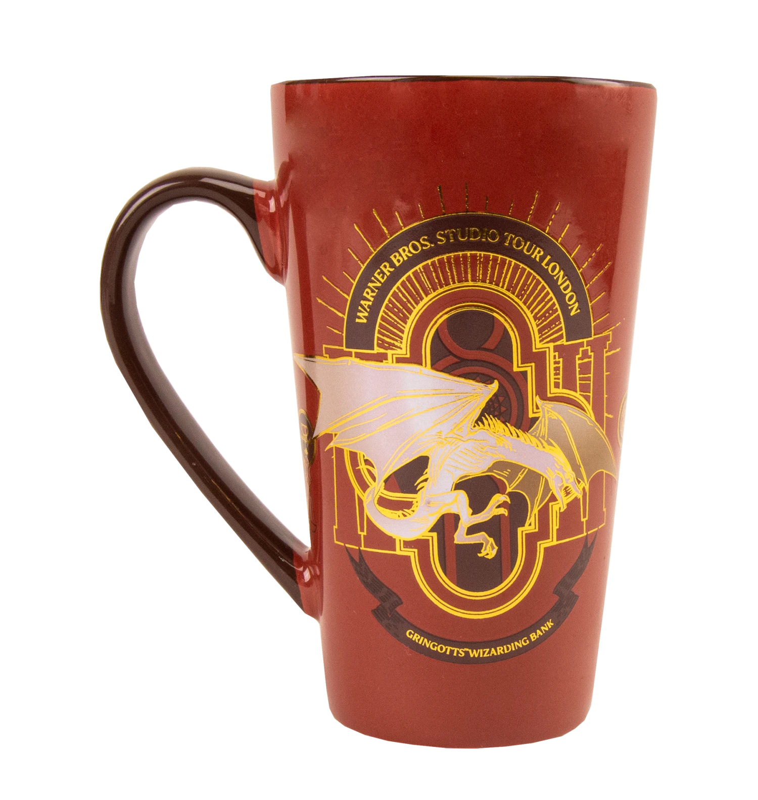 The mug reads Warner Bros. Studio Tour London” at the top with “Gringotts Wizarding Bank” in a banner at the bottom in gold font. The reverse of the mug features a gold print of ‘London’ vertically along the length. The mugs stand approximately 15cm tall and has a diameter of 8.5cm. Not suitable for dishwasher use. Hand wash only.