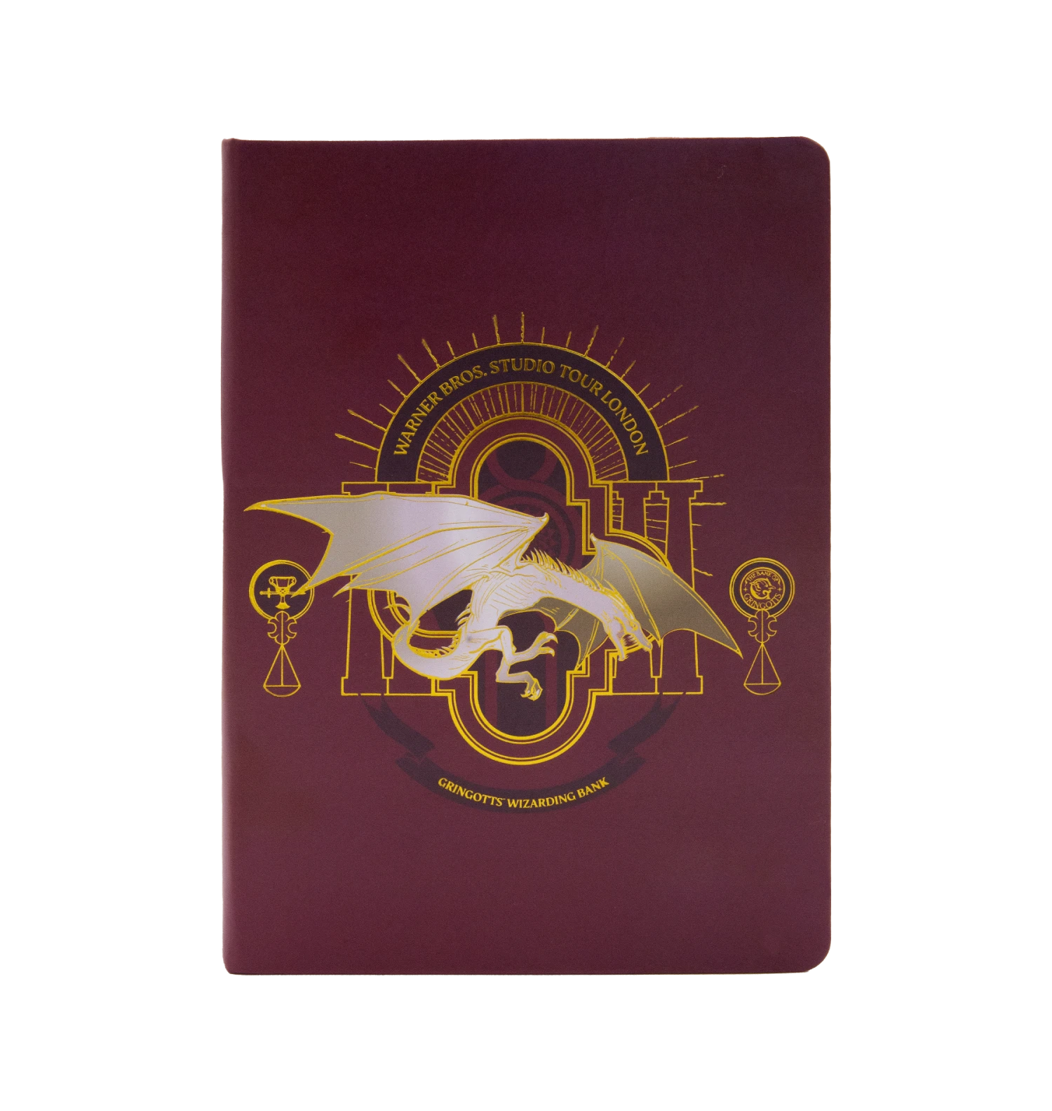 The exclusive London Iconic Gringotts collection celebrates the unique destination features of the Warner Bros. Studio Tour with this bespoke notebook. On a striking crimson background, a stark white Ukrainian Ironbelly dragon can be seen flying over top a geometric design representing the dramatic break-out from Gringotts Bank vault.