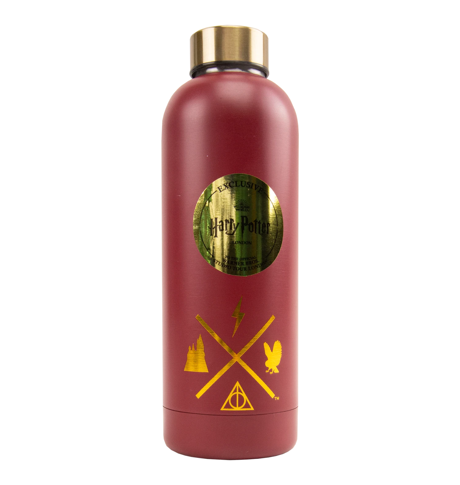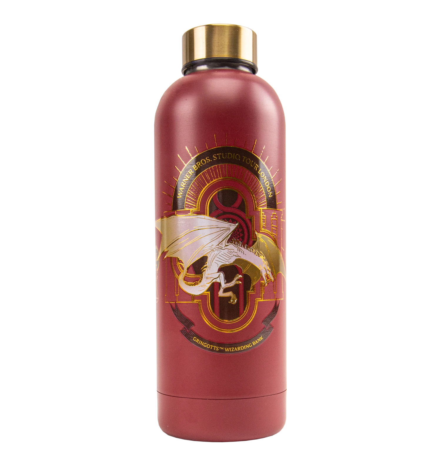 The exclusive London Iconic Gringotts collection celebrates the unique destination features of the Warner Bros. Studio Tour with this luxury water bottle. The exclusive print of a stark white Ukrainian Ironbelly dragon can be seen flying over top a geometric design representing the dramatic break-out from Gringotts Bank vault. The crimson-coloured water bottle reads “Warner Bros. Studio Tour London” at the top with “Gringotts Wizarding Bank” in a banner at the bottom in gold font.