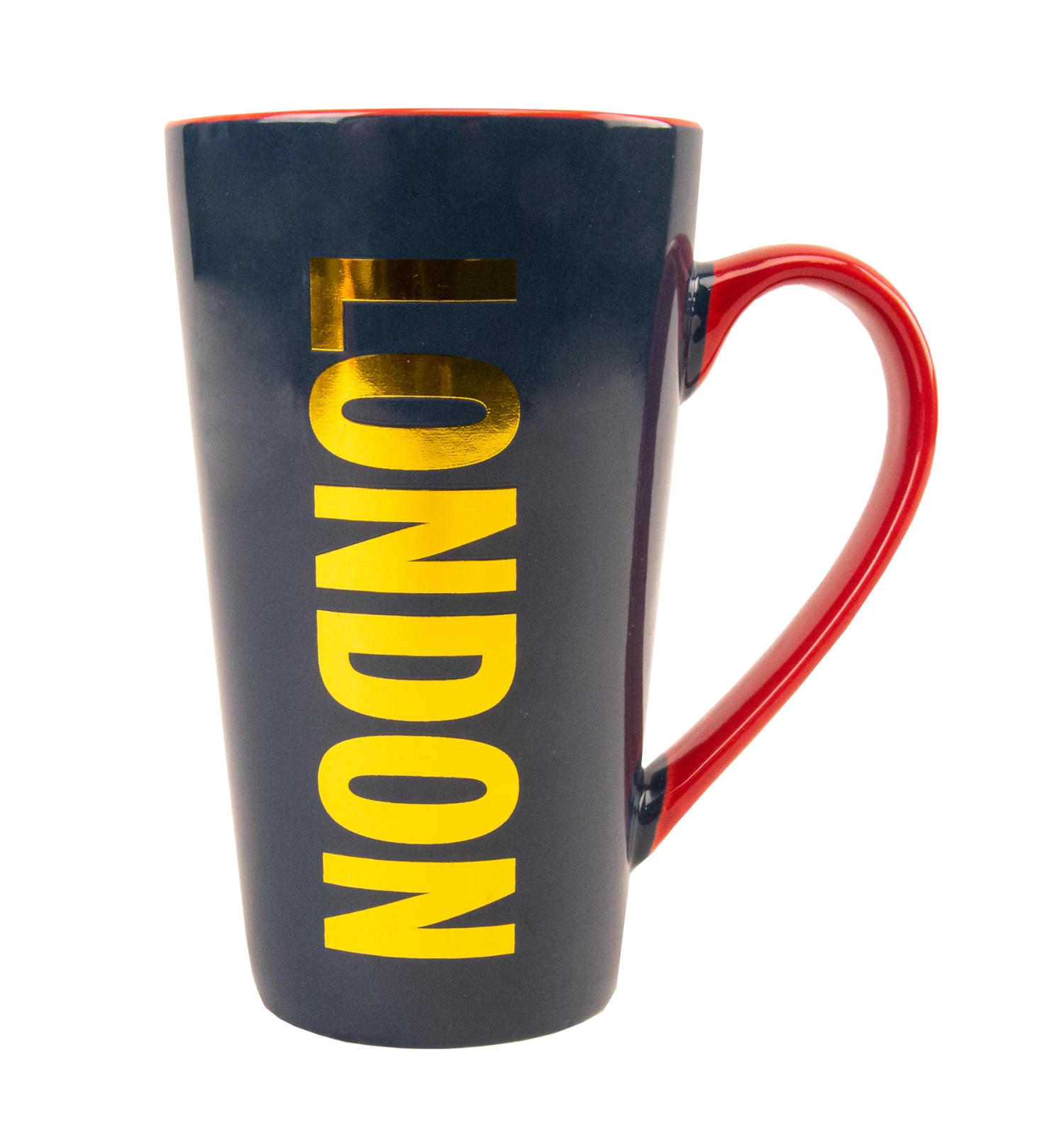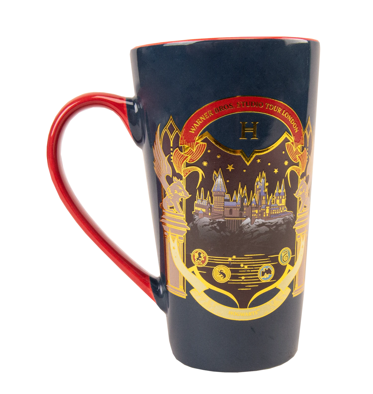 The mug reads Warner Bros. Studio Tour London” at the top with “Hogwarts” in a banner at the bottom in gold font. The reverse of the mug features a gold print of ‘London’ vertically along the length.  The mugs stand approximately 15cm tall and has a diameter of 8.5cm. Not suitable for dishwasher use. Hand wash only.