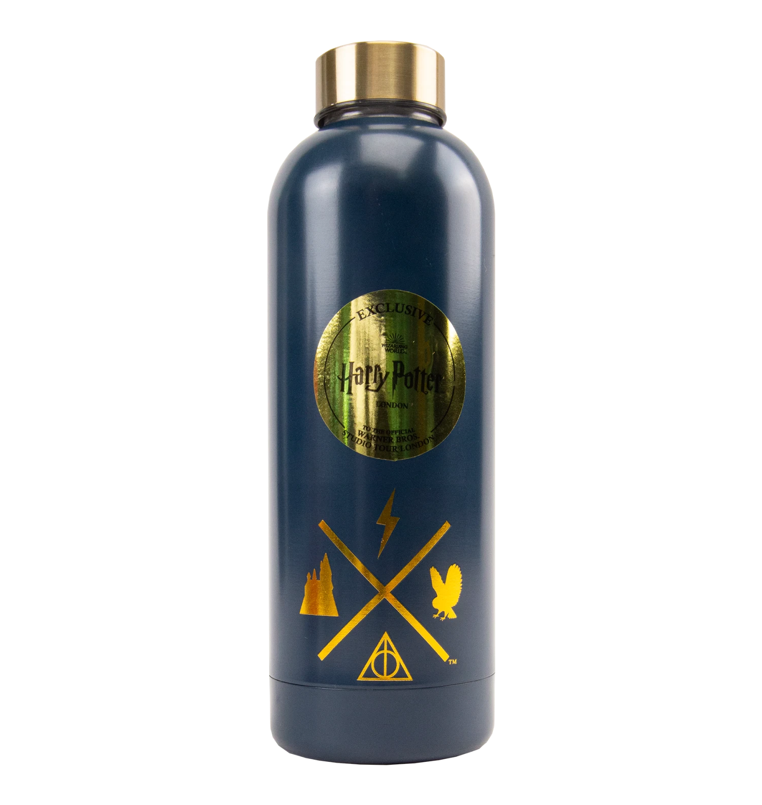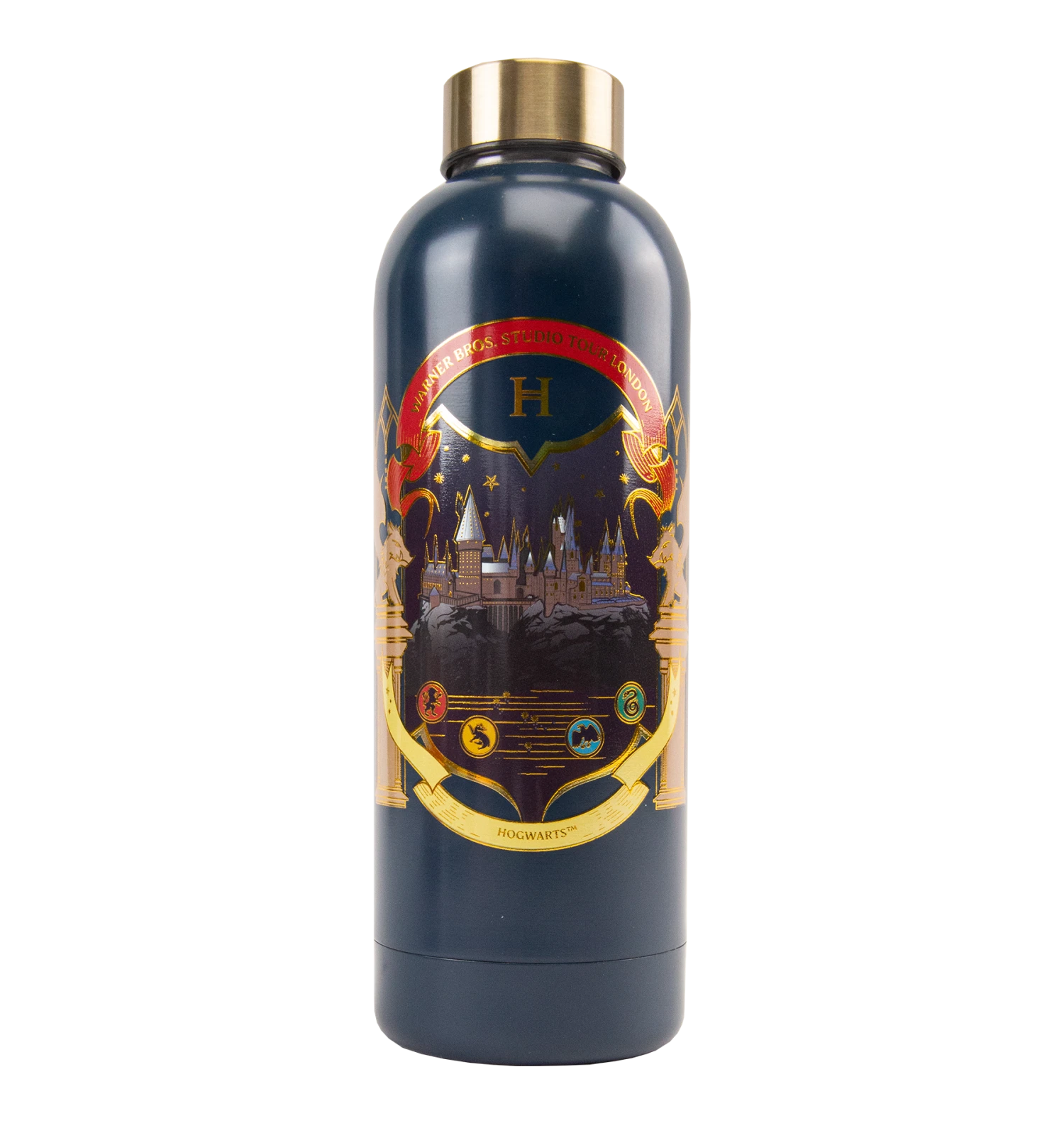 The recognisable four icons of the Hogwarts houses can be found at the bottom of the design in their traditional house colours. The vibrant navy-blue water bottle reads “Warner Bros. Studio Tour London” at the top with “Hogwarts” in a banner at the bottom in gold font.
