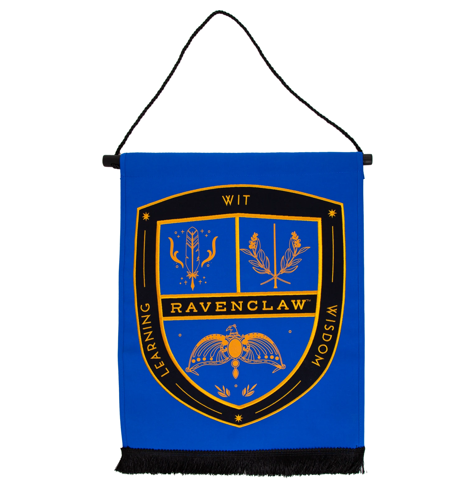 The design of this reinforced canvas banner is reminiscent of a heraldic crest on a shield, with the Ravenclaw house name proudly embroidered in large gold font in the center. The house traits are embroidered to each of the three crest edges, reading Wisdom Learning and Wit. House symbolism is printed throughout.