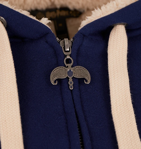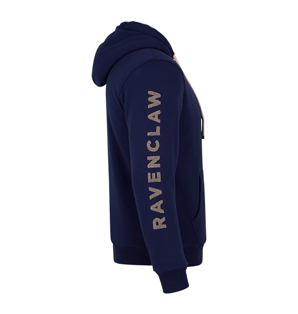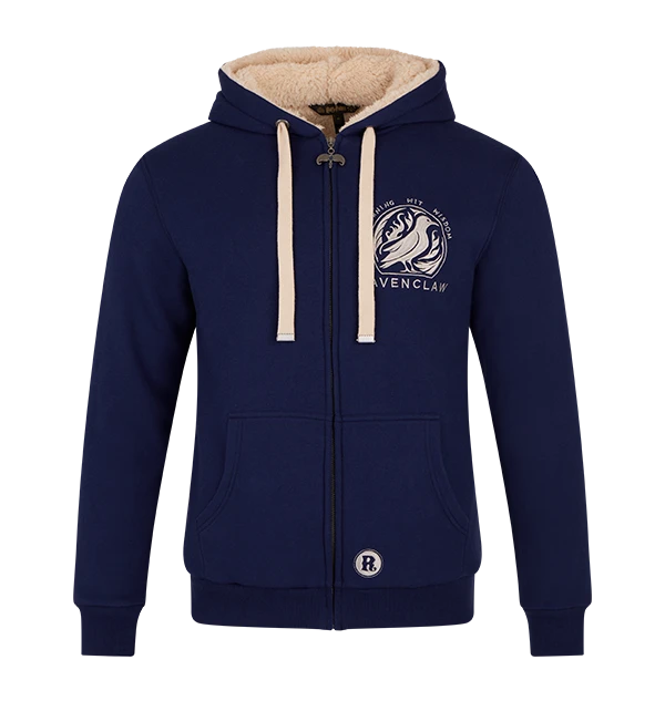 Refresh your wardrobe with this unisex Ravenclaw fleece hoodie. The navy-blue hoodie features a white eagle embroidered into the right-hand side of the chest. The hoodie is complete with the Ravenclaw house motto ‘Learning’, ‘Wit’ and ‘Wisdom’ printed in white.