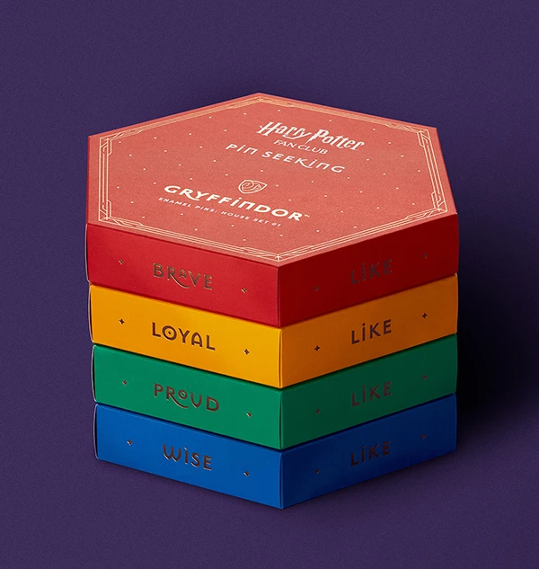 This red and gold 6-pin set is part of the Harry Potter Fan Club Pin Seeking collection and features a rare pin that can only be found in this set. The box is fitted with magnets so you can connect your box with other box sets as you grow your pin collection!
