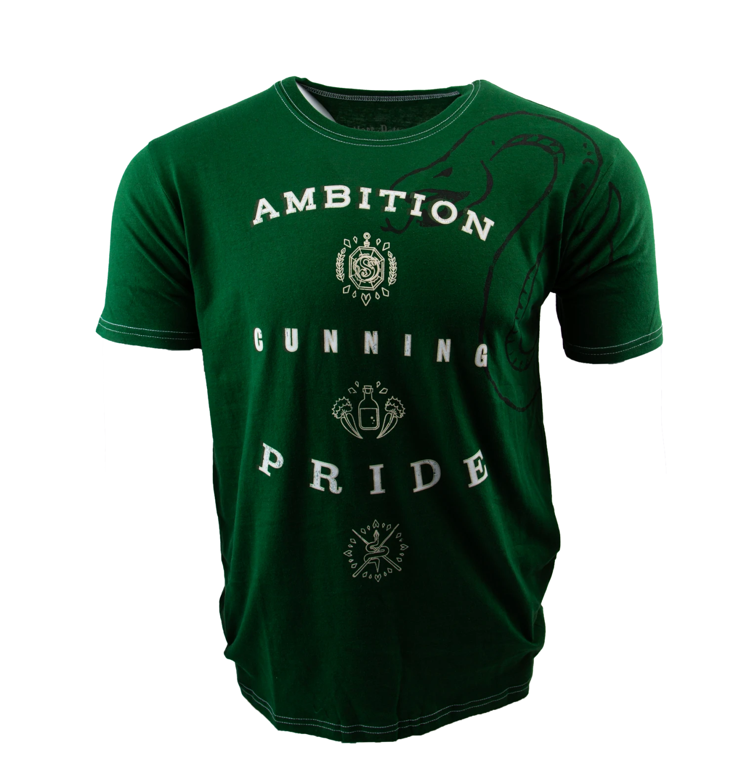 This Slytherin Attribute T-Shirt is covered in various Slytherin symbolism, proudly displaying the three most prominent traits associated with the house: Ambition, Cunning and Pride in bold, distressed fonts. A large screen print design of Slytherin’s iconic house mascot is featured across the left chest.