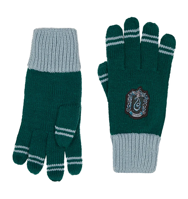 Keep warm and complete your Hogwarts school look with this striped knitted pair of Slytherin gloves. Both gloves are the trademark Slytherin colours of green and silver, and feature an embroidered patch of the Slytherin crest.
