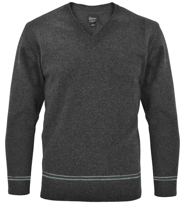 This charcoal V-Neck Slytherin School Sweater is knitted and assembled in the Scottish Mill that made the costumes for the cast and extras in the Harry Potter film series.